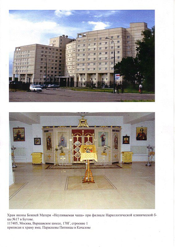 Настоятелю Подворья при храме свт. Алексия, митрополита Московского, всея России чудотворца в Северном Бутове г. Москвы озаботиться совершением богослужений и церковных чинопоследований в приписном храме, а также духовным окормлением сотрудников и пациентов означенного медицинского учреждения.