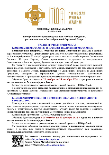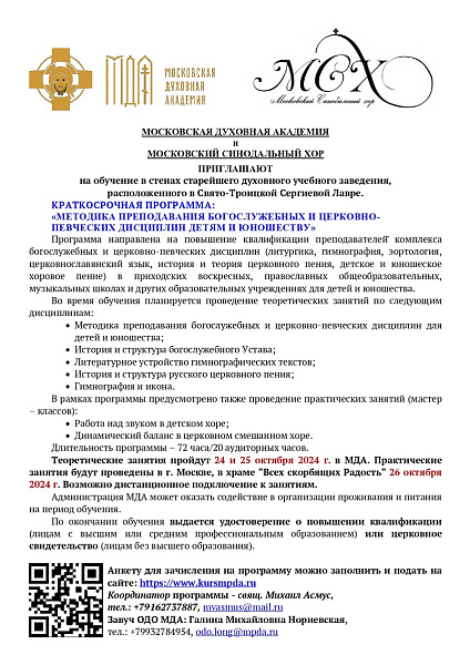 Краткосрочная обучающая программа «Методика преподавания богослужебных и церковно- певческих дисциплин детям и юношеству»