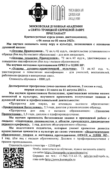 О реализации образовательных программ Отдела дополнительного образования Московской Духовной Академии с 6 июня по 3 июля 2023 г.