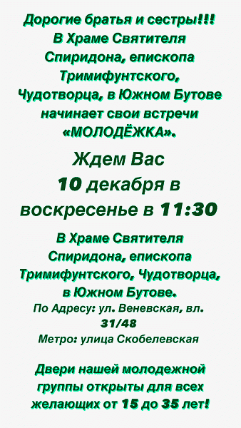 В Храме Святителя Спиридона, епископа Тримифунтского, Чудотворца, в Южном Бутове начинает свои встречи «МОЛОДЁЖКА»