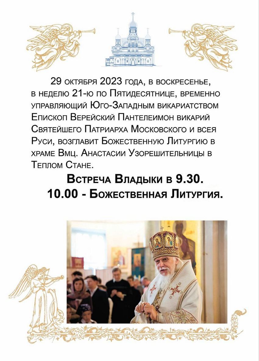 29 октября 2023 года, в воскресенье, в неделю 21-ю по Пятидесятнице временно управляющий Юго-Западным викариатством Епископ Верейский Пантелеимон викарий Святейшего Патриарха Московского и всея Руси возглавит Божественную Литургию в храме Вмц. Анастасии Узорешительницы в Теплом Стане.