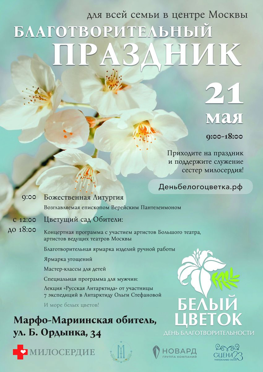 21 мая с 9:00 до 18:00 приглашаем всех на благотворительный праздник "Белый цветок" в Марфо-Мариинскую обитель, ул. Большая Ордынка, д.34