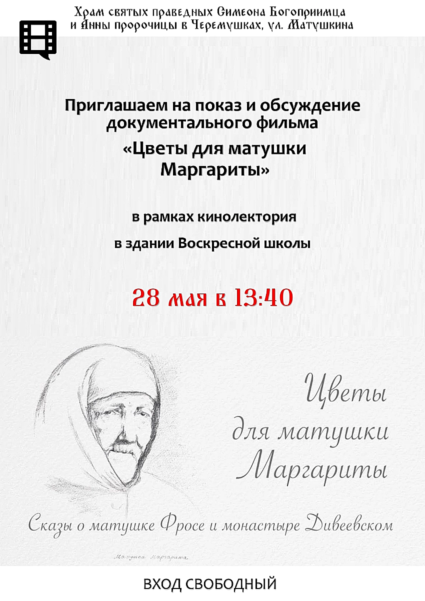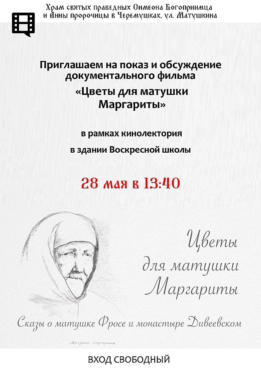 28 мая в 13:40 приглашаем всех на показ и обсуждение документального фильма "Цветы для матушки Маргариты".