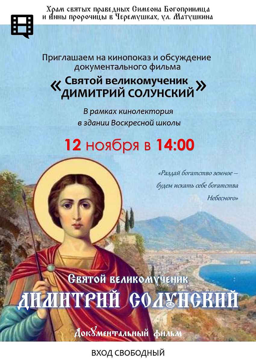 12 ноября в 14:00 приглашаем на кинопоказ и обсуждение документального фильма "Святой великомученик Дмитрий Солунский".