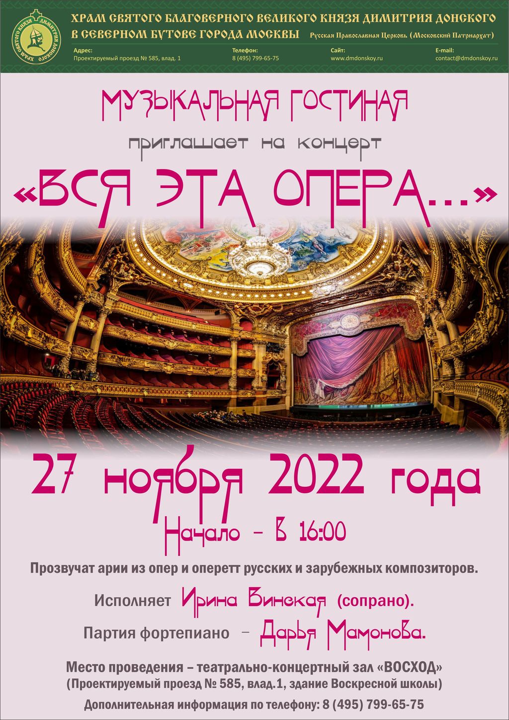 27 ноября 2022 года в 16:00 Храм Святого Благоверного Великого князя Дмитрия Донского в Северном Бутове приглашает на концерт "Вся эта опера". Прозвучат арии из опер и оперетт русских и зарубежных композиторов.
