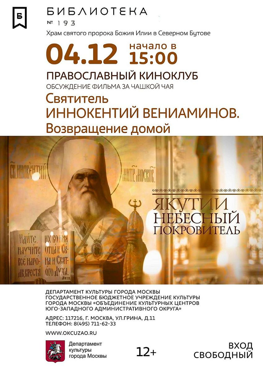 04 декабря в 15:00 приглашаются все желающие на просмотр и обсуждение фильма "Святитель Инокентий Вениаминов. Возвращение домой".