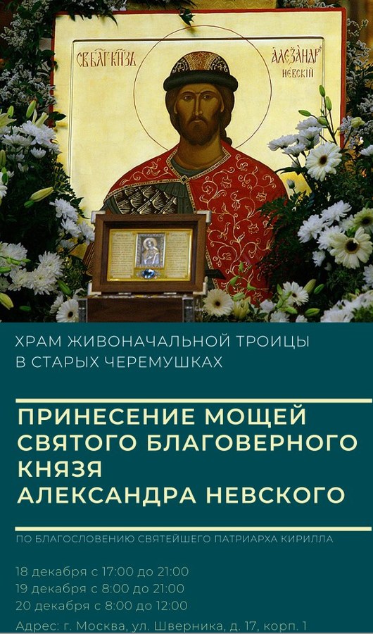 По благословению Святешего Патриарха Кирилла в Юго-Западное московское викариатство с 18 по 20 декабря с.г. будут принесены для поклонения мощи святого благоверного князя Александра Невского.