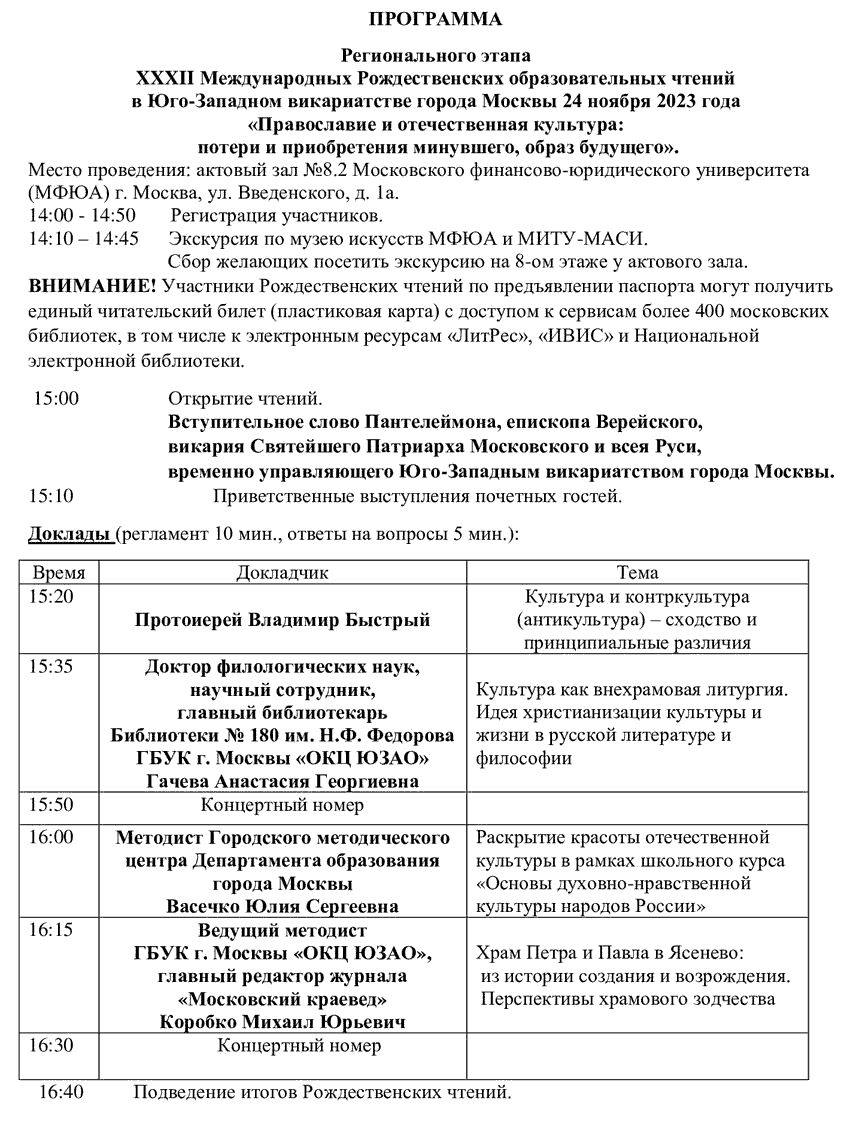 24 ноября 2023 года при поддержке Префектуры ЮЗАО и Московского финансово-юридического университета (МФЮА) в Юго-Западном викариатстве города Москвы пройдет Региональный этап XXXII Международных Рождественских образовательных чтений «Православие и отечественная культура: потери и приобретения минувшего, образ будущего».