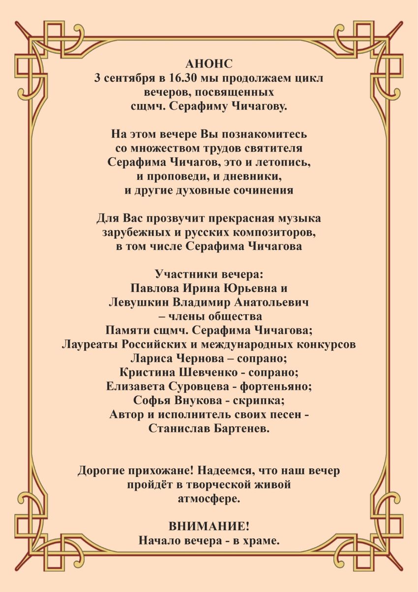 По благословению настоятеля храма сщмч. Серафима иерея Максима Глухих, 3 сентября 2023 года в Воскресной школе храма состоится вечер памяти священномученика.
