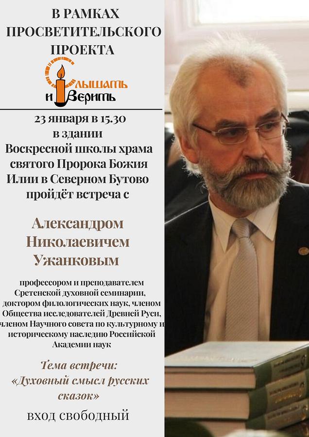 23 января в 15:30 в здании Воскресной школы храма святого Пророка Божия Илии в Северном Бутово пройдет встреча с Александром Николаевичем Ужанковым "Духовный смысл русских сказок".