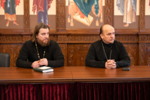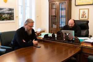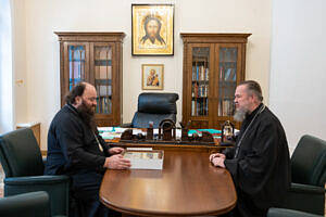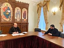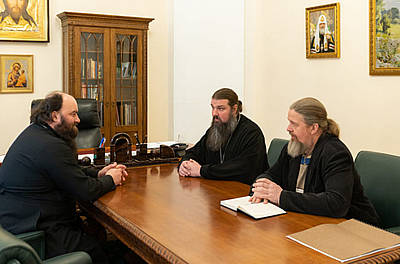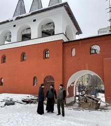 Председатель ФХУ епископ Парамон обсудил с настоятелем храма праведного воина Феодора Ушакова в Москве игуменом Дамианом вопросы эксплуатации нового церковного комплекса