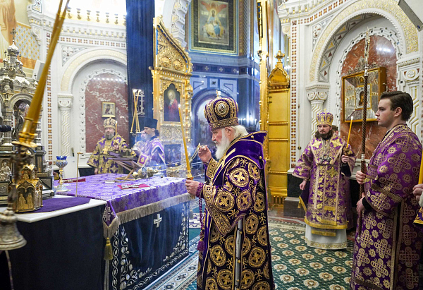 В канун Недели Крестопоклонной Святейший Патриарх Кирилл совершил всенощное бдение с чином выноса Креста в Храме Христа Спасителя