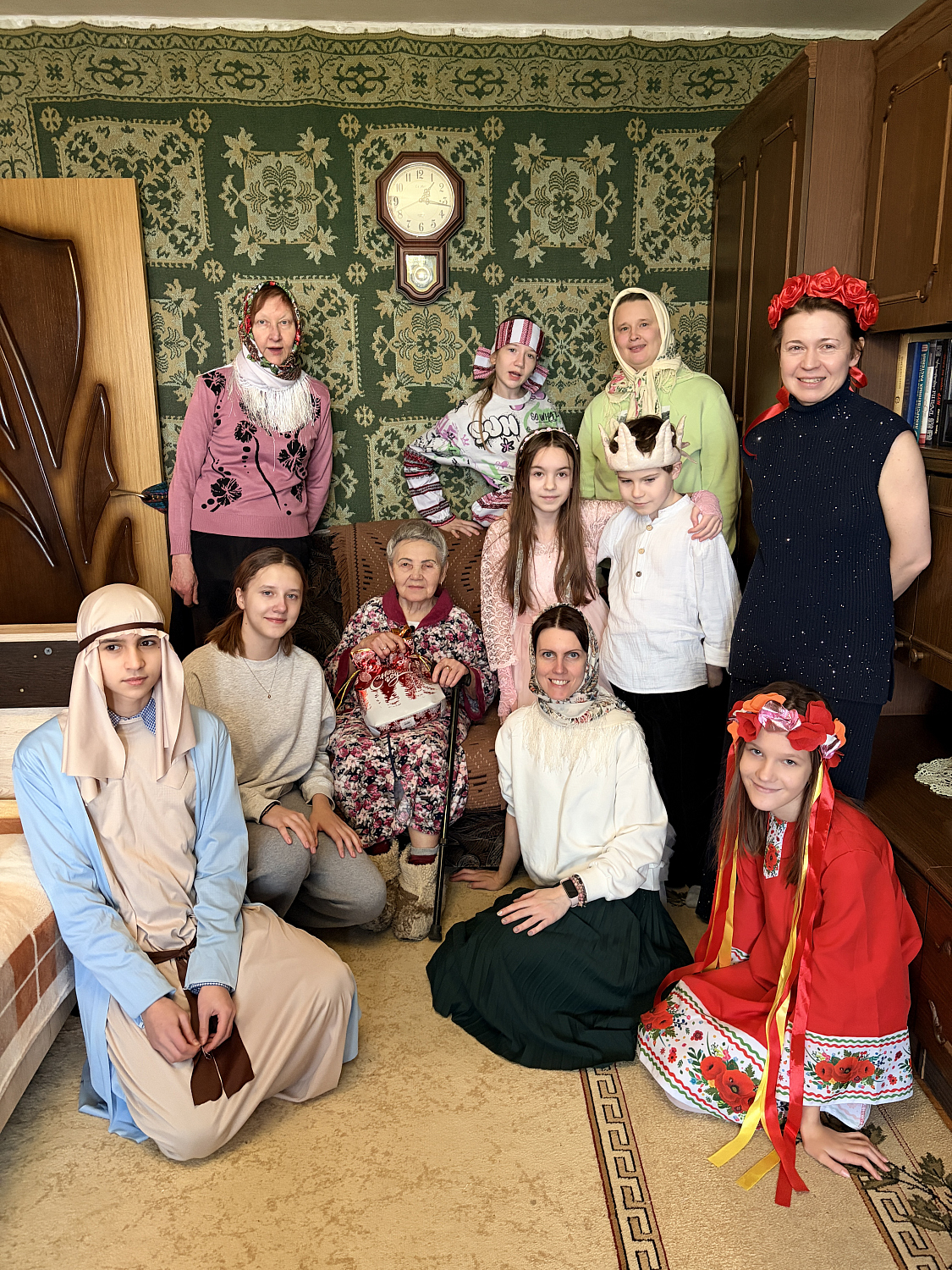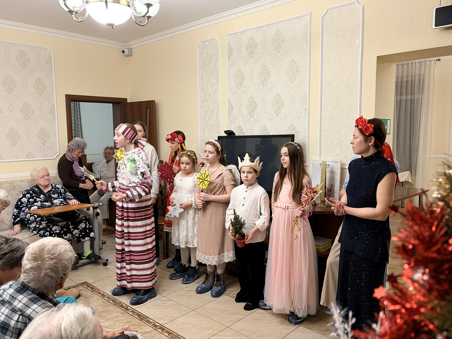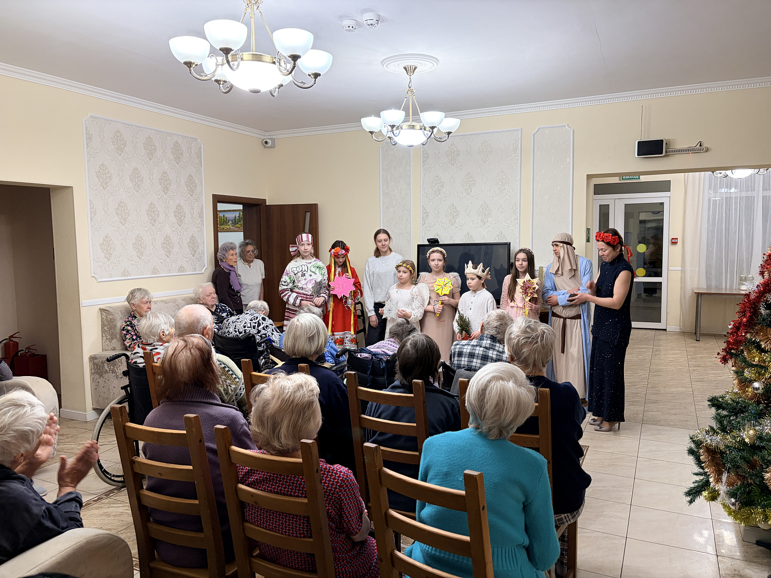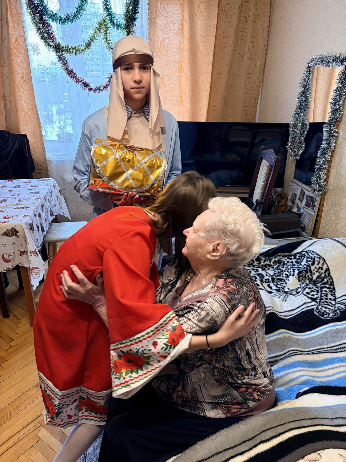 Особое внимание было уделено старейшей прихожанке храма Галине Ивановне, ныне проживающей в подмосковном пансионате для пожилых людей и лишенной возможности присутствия в храме. Вечером волонтеры специально приехали к ней в гости, наполняя ее праздник теплом молитвы и радости. Для нее и остальных постояльцев пансионата ребята подготовили особую программу, в которой прозвучали любимые Рождественские колядки и стихотворения.