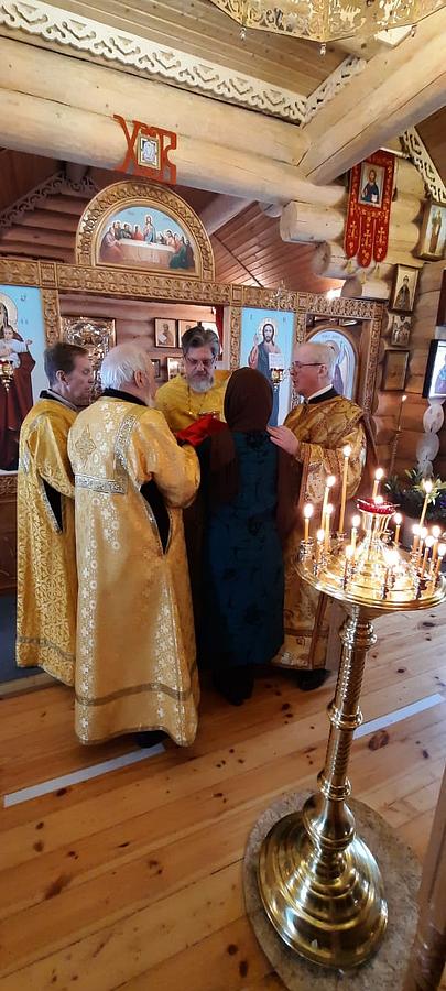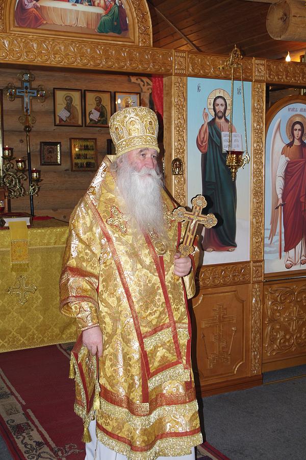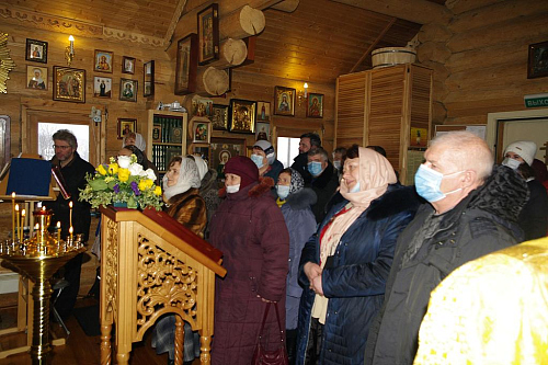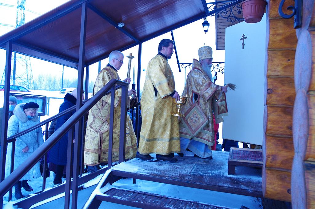 После Богослужения в своем обращении к Преосвященному епископу Феофилакту настоятель храма иерей Виталий Никишин поблагодарил Владыку за архипастырское попечение о временном храме, чин малого освящения которого он совершил 14 марта 2015 года.