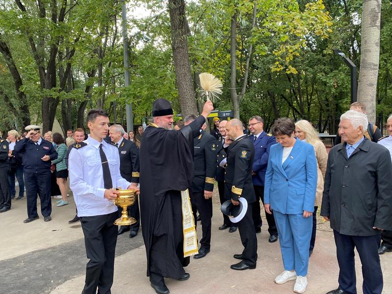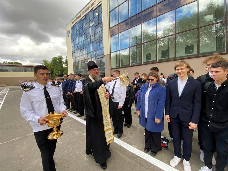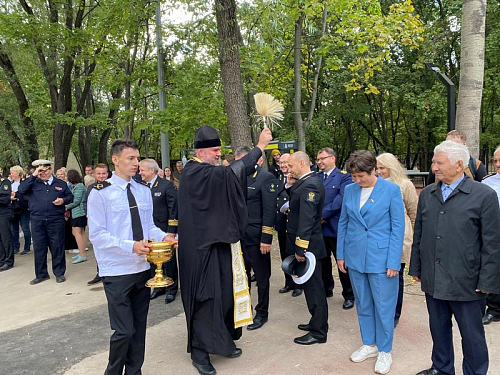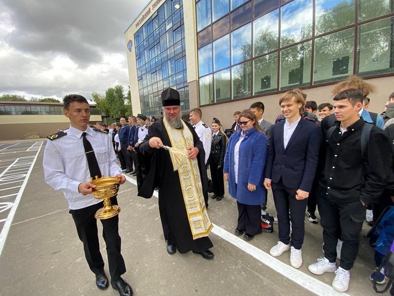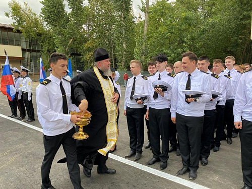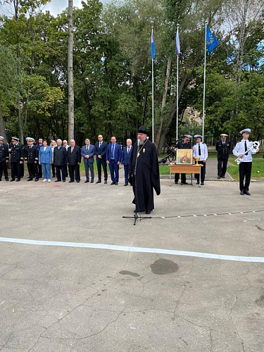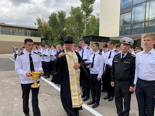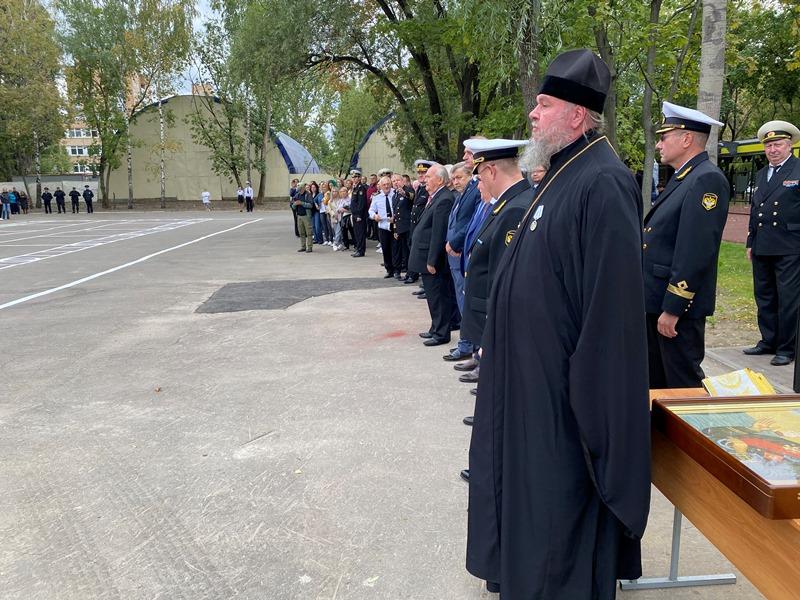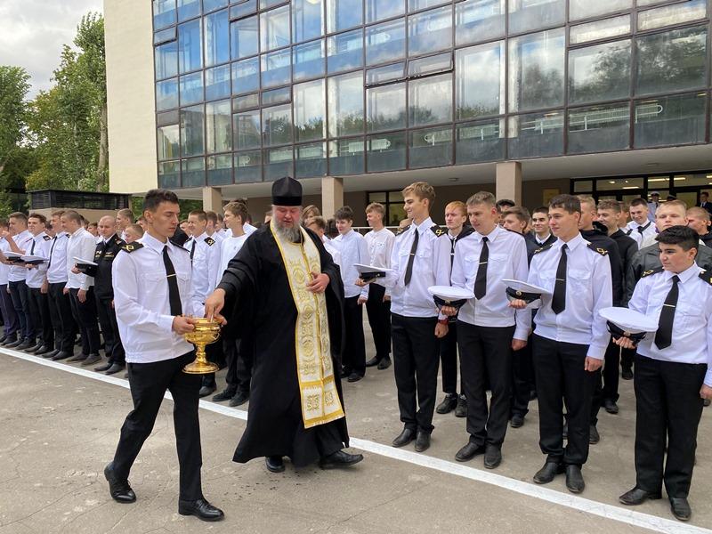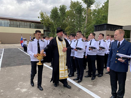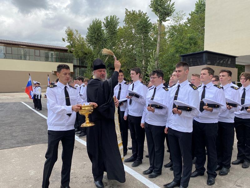 Торжественное построение по случаю Дня знаний окончилось благословением настоятеля храма святого праведного воина Феодора Ушакова игумена Дамиана (Залетова), который обратился к учащимся, преподавателям, родителям и гостям со словом приветствия и по традиции окропил всех Святой водой. В своем слове игумен Дамиан обратил внимание всех присутствующих на пример жизни святого непобедимого адмирала Флота Российского Феодора Ушакова и подарил Академии его икону.