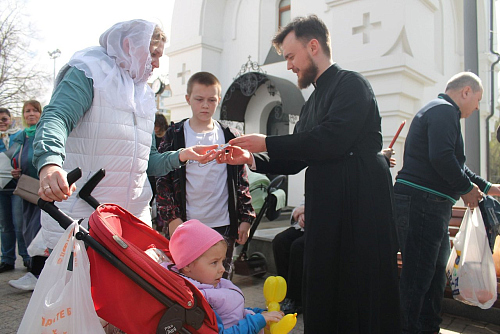 Для самых маленьких была организована раздача собачек из шариков, что вызвало радостные улыбки на лицах детей. Кроме того, участники щедро раздавали экземпляры Евангелия, делясь с окружающими светом Пасхи.