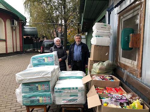 Были переданы продукты питания (мука, макароны, крупы, растительное масло, сахар, сладости), средства гигиены доя лежачих больных, бытовые принадлежности, общим весом 350 кг.