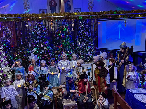 Под волшебную музыку дети входят в помещение домика, освещаемое лишь огоньками новогодних гирлянд. Всё вокруг украшено елками, новогодними игрушками и огоньками! Трещат дрова в русской печи. На сцене под елкой стоят деревянные ясли, а вокруг светящиеся фигуры олененка, барашка, медведя. Всё говорит, напоминает и погружает в атмосферу той ночи, той необыкновенной ночи, в которую пришел на Землю Христос...