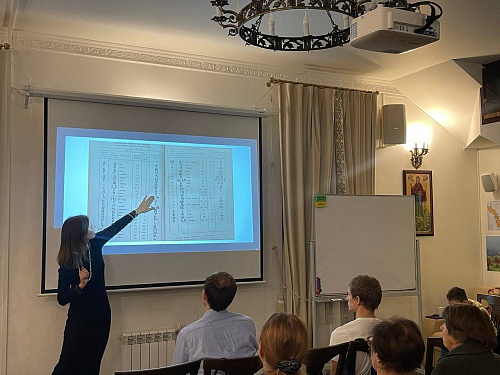 Говоря о развитии книжной учёности, Александра Евгеньевна поведала слушателям о нелёгком труде писцов, а также провела небольшое практическое занятие по чтению фрагментов древних текстов. Участникам воскресной беседы удалось почувствовать себя в роли исследователей. Так, разбирая глаголические надписи на стенах Софийского собора в Великом Новгороде, пришлось поразмышлять, кем и для чего они сделаны.