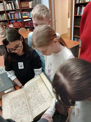 Затем в школьной библиотеке ученики познакомились с деятельностью первопечатника диакона Ивана Федорова и историей создания первой русской печатной книги — Апостол. А еще у ребят появилась возможность познакомиться со старинными изданиями, хранящимися в библиотеке.