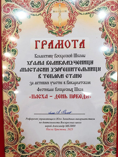 17 мая 2025 года по благословению и.о. настоятеля храма Великомученицы Анастасии Узорешительницы в Тёплом Стане иерея Димитрия Борсука детский хор Воскресной школы под руководством Марии Вадимовны Никулкиной принял участие в Викариатском Фестивале Воскресных школ «Пасха - День Победы».