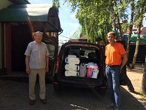Были доставлены: святая вода с молебна Животворящему Кресту Господню, средства гигиены по уходу за лежачими больными, памперсы, а также продукты, пожертвованные прихожанами храма.