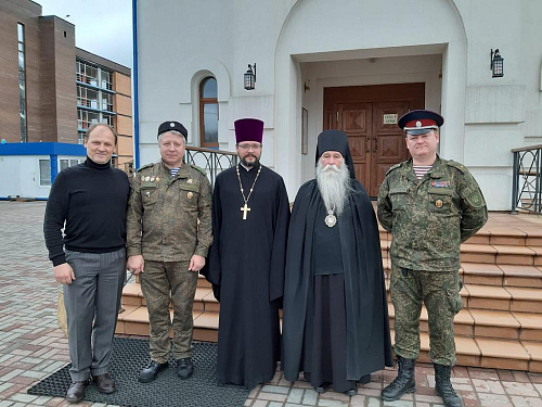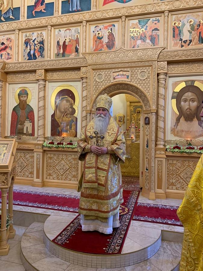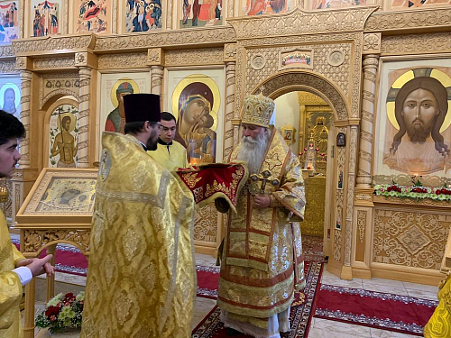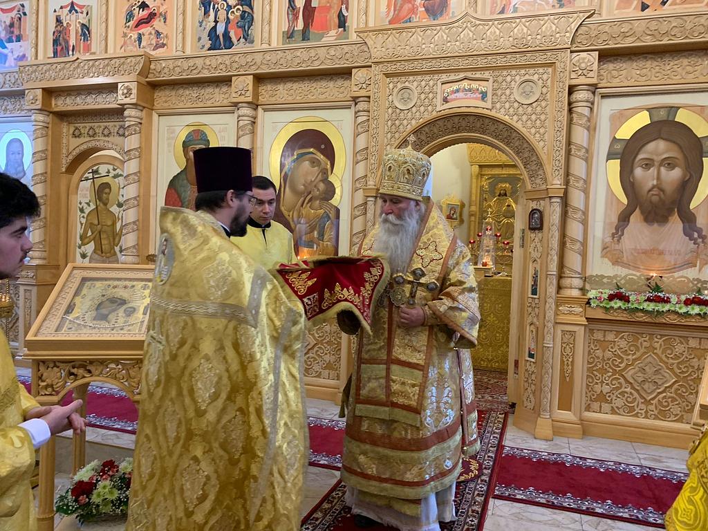 После Богослужения настоятель храма выразил благодарность Его Преосвященству за радость совместного Богослужения и общей молитвы и преподнес в дар для Андреевского ставропигиального монастыря Богослужебные покровцы и воздух.
