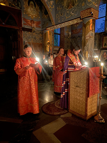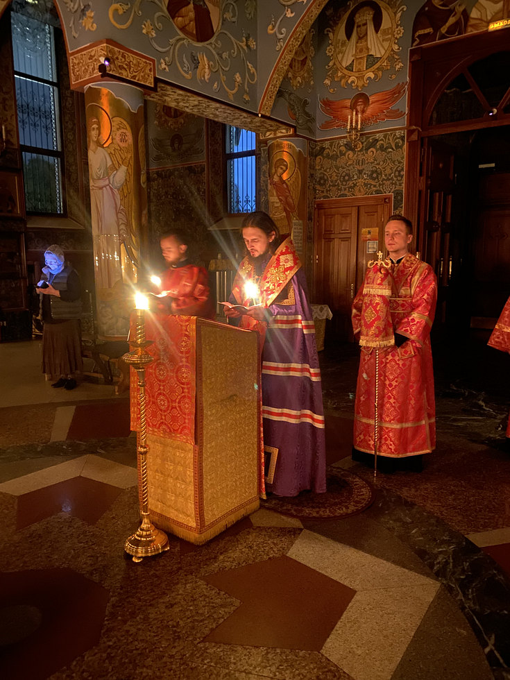 Его Преосвященству сослужил клирик храма диакон Константин Бабак. Перед началом Литургии читался акафист Воскресению Христову.