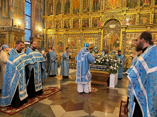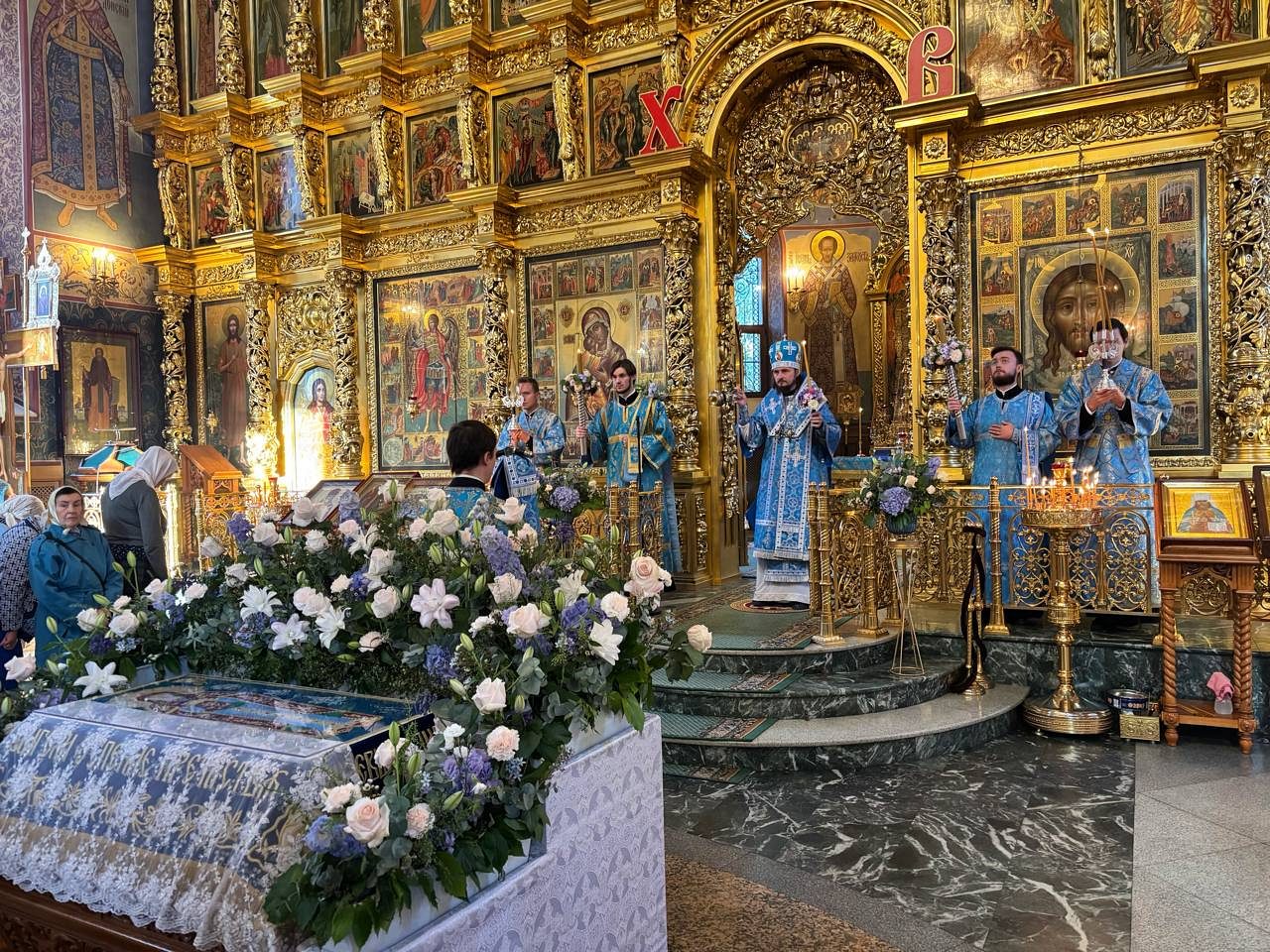 Во время богослужения прозвучала 17-я кафизма с припевами – похвалами. После великого славословия Преосвященнейший Владыка возглавил Крестный ход с Плащаницей Божией Матери.