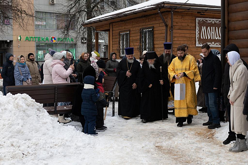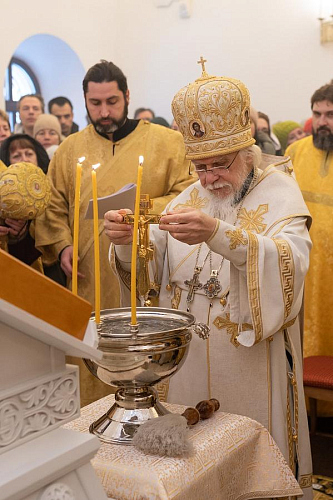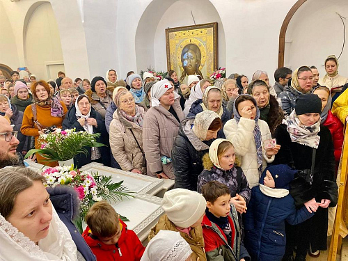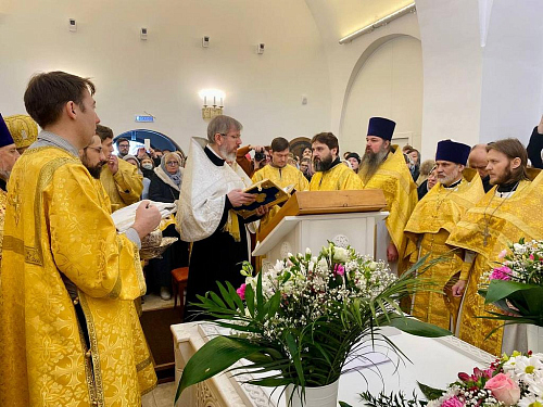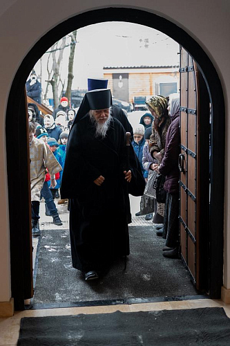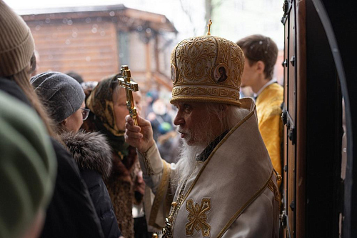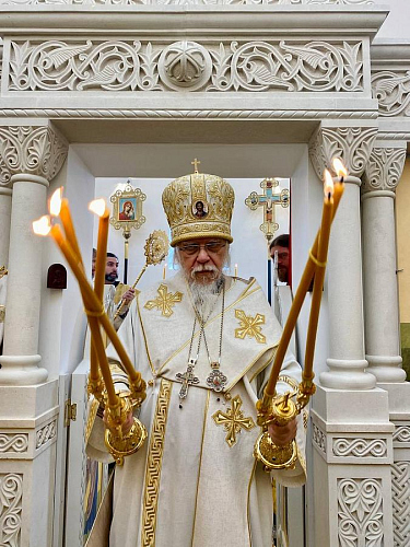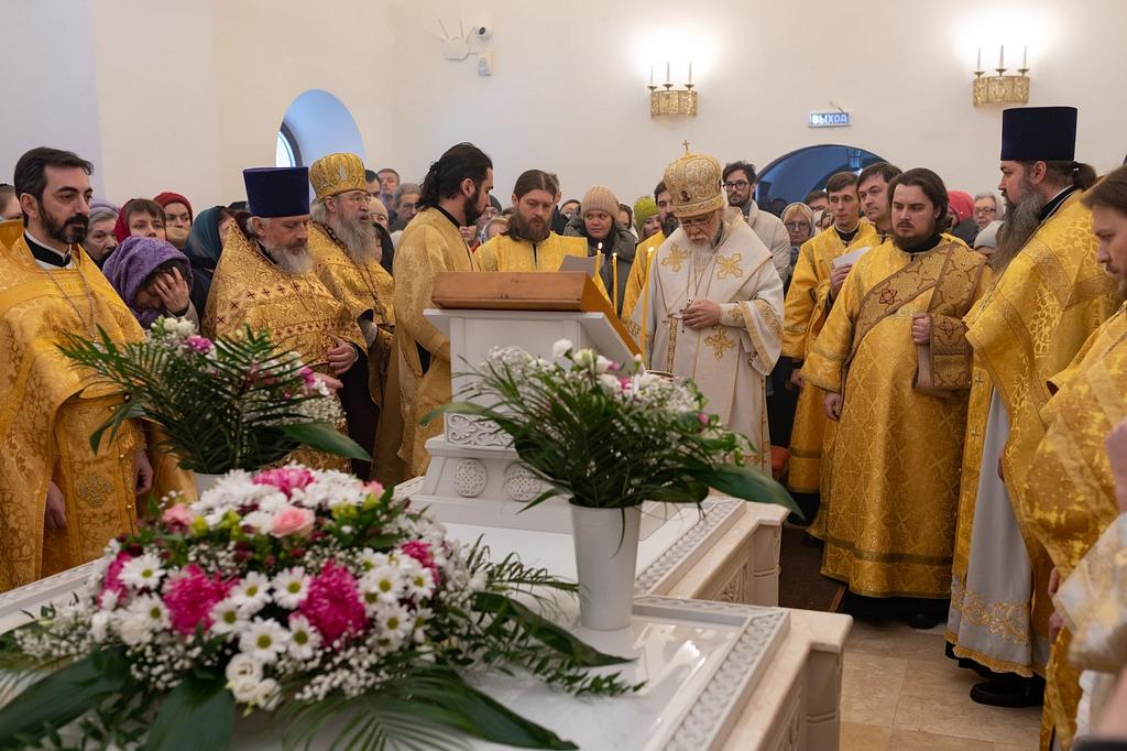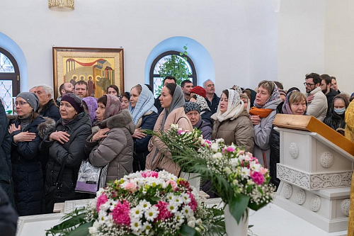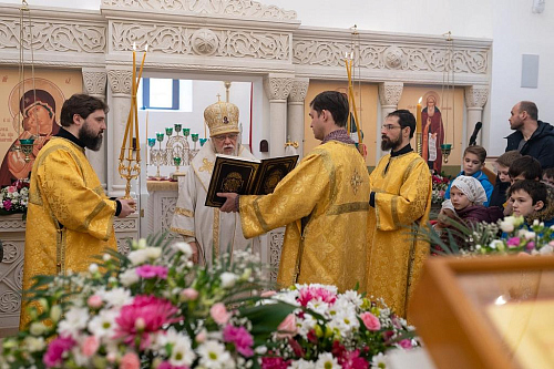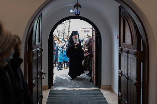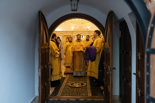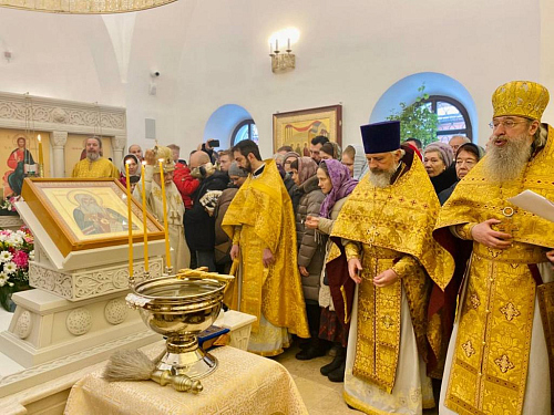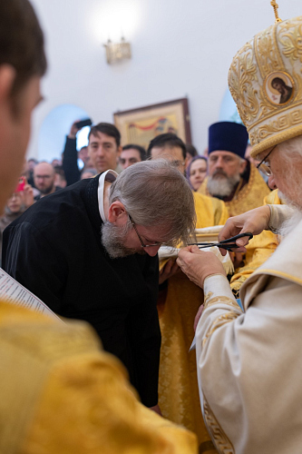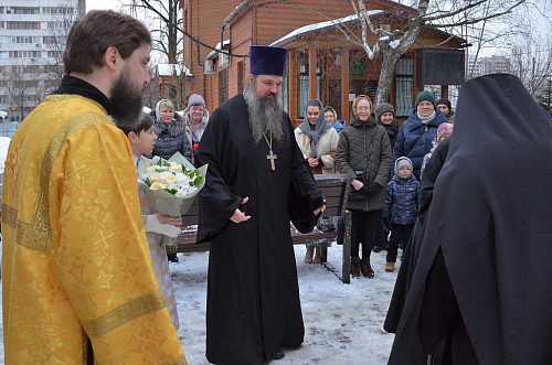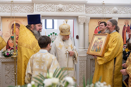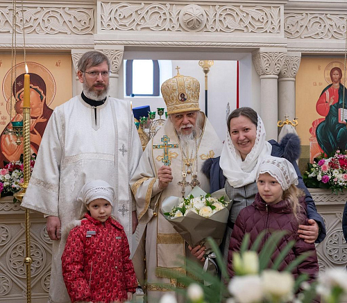 Настоятель храма священномученика Ермогена в Зюзине иерей Иоанн Омелянчук поблагодарил Владыку за совершенное освящение храма и совместное богослужение и преподнес в дар семейную икону.