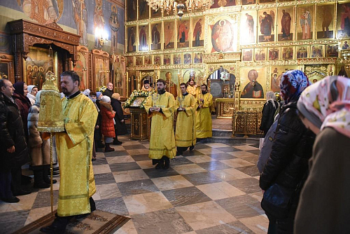 Затем было совершено славление святителю Николаю и святому благоверному князю Александру Невскому, мощи которого на несколько дней принесены в храм Живоначальной Троицы в Старых Черемушках для молитвенного поклонения.