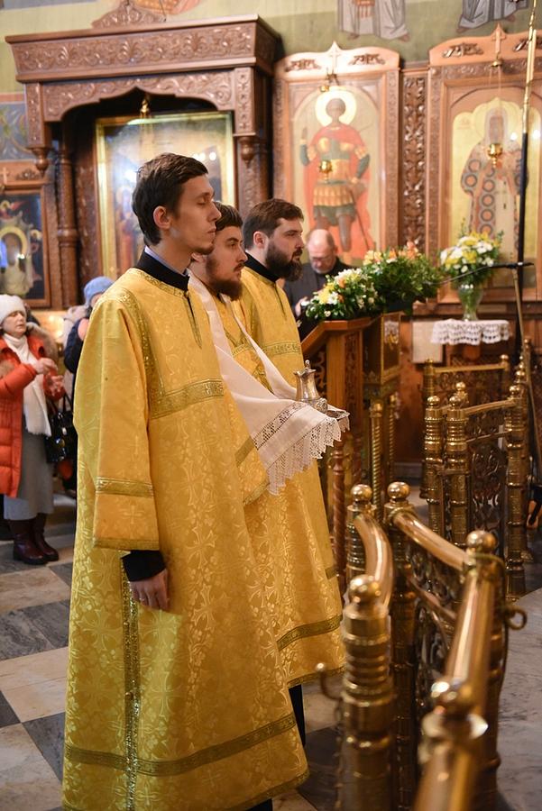 После сугубой ектении Владыка вознес молитву о заключенных: «Господи, Иисусе Христе, Боже наш, Крестом во ад сошедый, диавола посрамивый, заклепы и вратницы адовы разрушивый, узники свободивый и жизнь миру Твоему даровавый, призри на молитву смиренных и недостойных раб Твоих, ко Твоему Величеству бесприкладному и бездне человеколюбия прибегающих и яко Благосерд Твоею милостию и щедротами посети грехми обремененныя и в заключении темничном сущия: Ты бо рекл еси, Господи, яко хотением не хощу смерти грешника, но еже обратитися и живу быте ему. Услыши в скорби и тесноте душевной призывающих Тя: в немощи находящихся душевныя и телесныя их раны уврачуй; в ожесточении сердечном сущия к покаянию обрати; правды и оправданий Твоих ищущих в вере и творении заповедей утверди и на путь спасения настави. Ты бо еси, Господи, помощь беспомощным, надеждо ненадежным, спасение отчаянным, всем вся буди и приведи ко пристанищу хотения Твоего. Да поем и славим Тя со Безначальным Твоим Отцем, и Пресвятым и Благим и Животворящим Твоим Духом ныне, и присно и во веки веков. Аминь».
