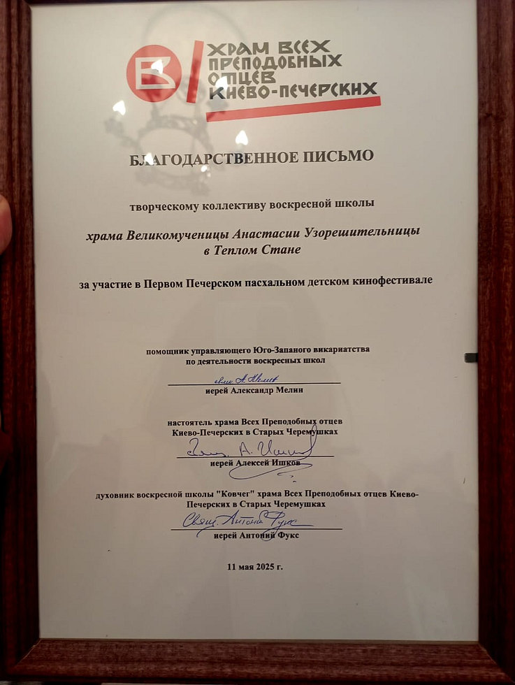 11 мая 2025 года по благословению и.о. настоятеля храма Великомученицы Анастасии Узорешительницы в Тёплом Стане иерея Димитрия Борсука представители Воскресной школы и молодежной организации храма приняли участие в Печерском Пасхальном детском кинофестивале.