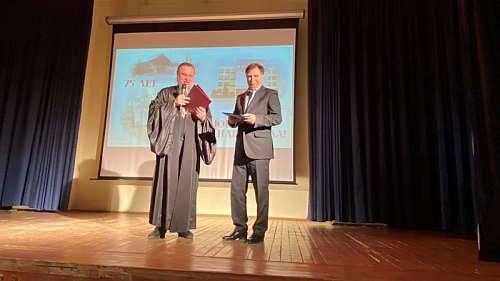 Перед собравшимися в актовом зале был пронесен Государственный флаг России и прозвучал Гимн Российской Федерации. В коллективном исполнении гимна Российской Федерации слились голоса зрителей, участников и почетных гостей мероприятия.