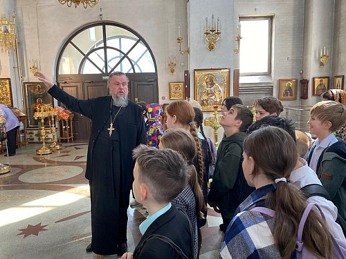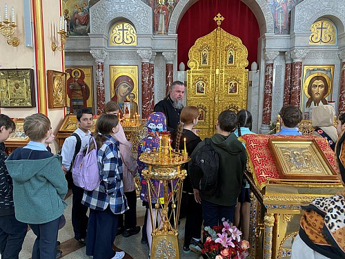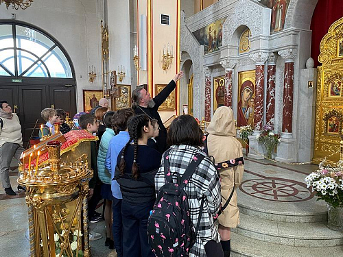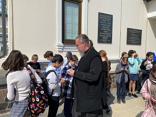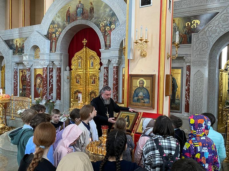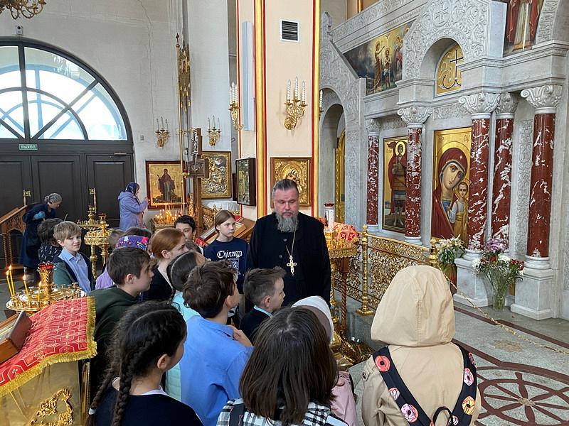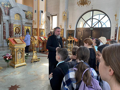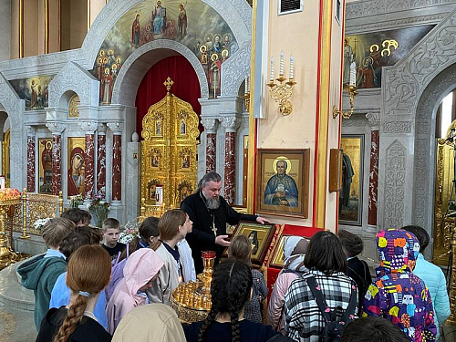 Внутри храма игумен Дамиан рассказал школьникам о тех событиях жизни Небесного покровителя храма - святого адмирала Феодора Ушакова и других Святых, которые стали примерами добродетели, преданности, смелости и скромности.