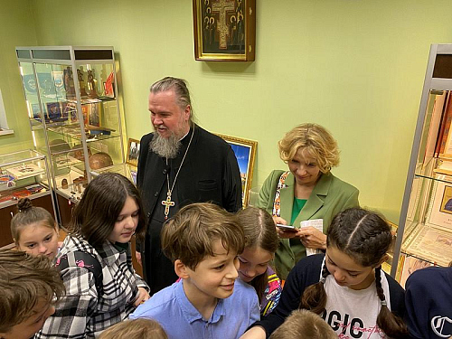 Игумен Дамиан подарил каждому школьнику календарик с изображением храма. Также ребят угостили конфетами.