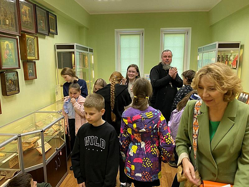 Школьники посетили церковно-археологический музей храма. Игумен Дамиан показал им особый экспонат. Этот уникальный экспонат передали в новый музей представители Московского отделения Российского военно-исторического общества и поисковиков Военно-патриотического объединения «Нарский рубеж».