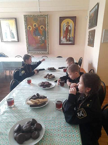 Внутри храма игумен Дамиан рассказал школьникам о тех событиях жизни Небесного покровителя храма - святого адмирала Феодора Ушакова и других Святых, которые стали примерами добродетели, преданности, смелости и скромности.