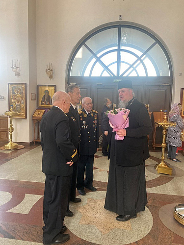 Настоятель храма игумен Дамиан (Залетов) сердечно поблагодарил ветеранов и друзей храма за многогранную общественную патриотическую работу и вручил памятную медаль святого праведного воина Феодора Ушакова в честь 20-летия его канонизации.