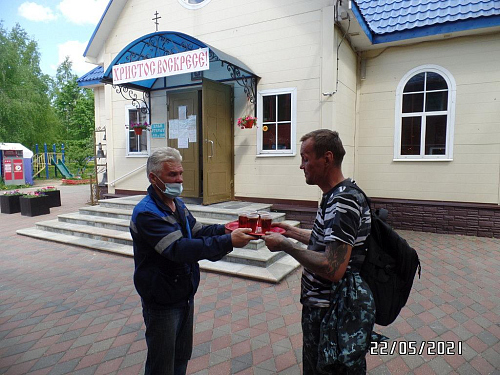 При этом с бездомными волонтеры проводят беседы о Православной вере, пред трапезой совершают молитвы, соблюдая санитарные нормы и социальную дистанцию.