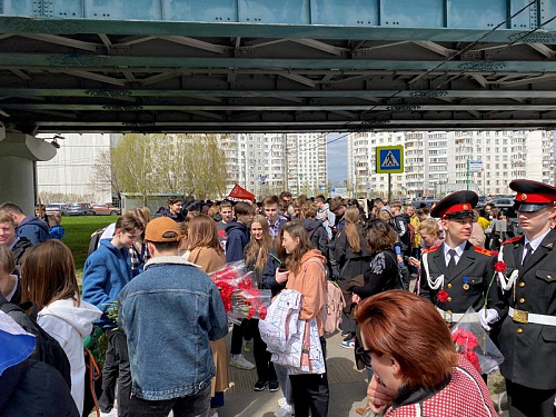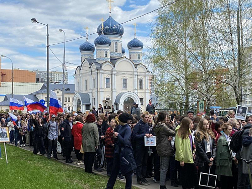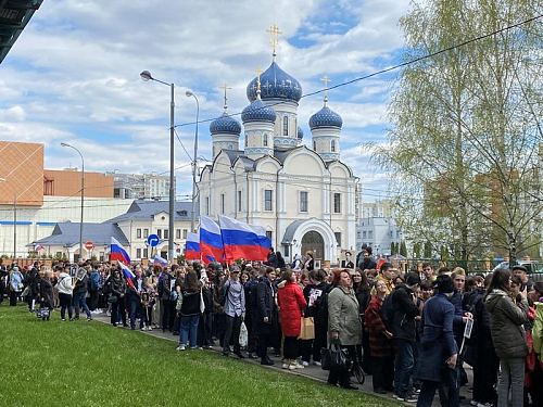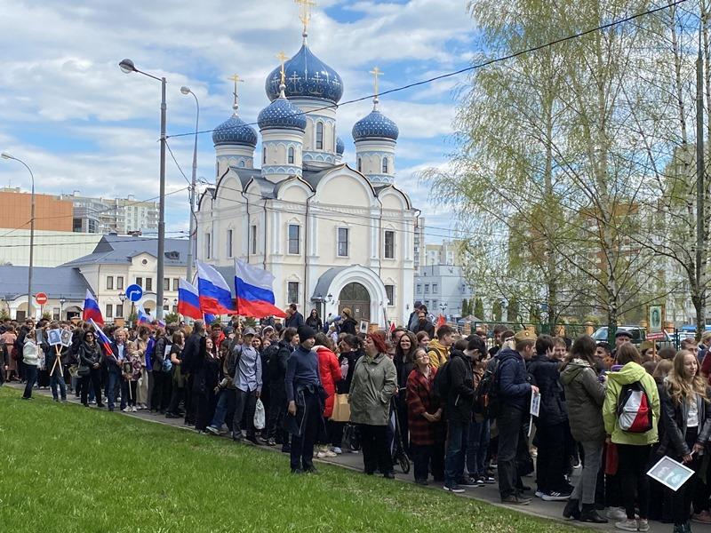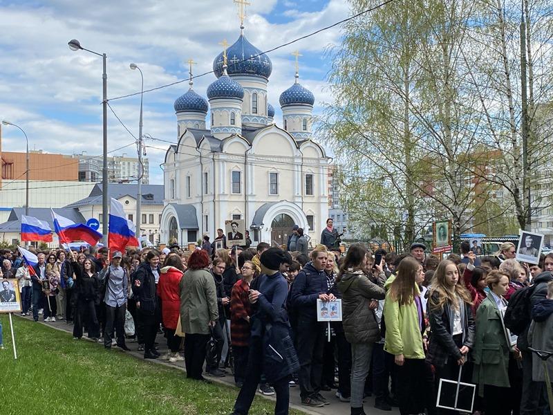 Сбор участников шествия «Бессмертный полк» проходил у станции метро Бульвар Адмирала Ушакова, рядом с храмом святого праведного воина Феодора Ушакова.