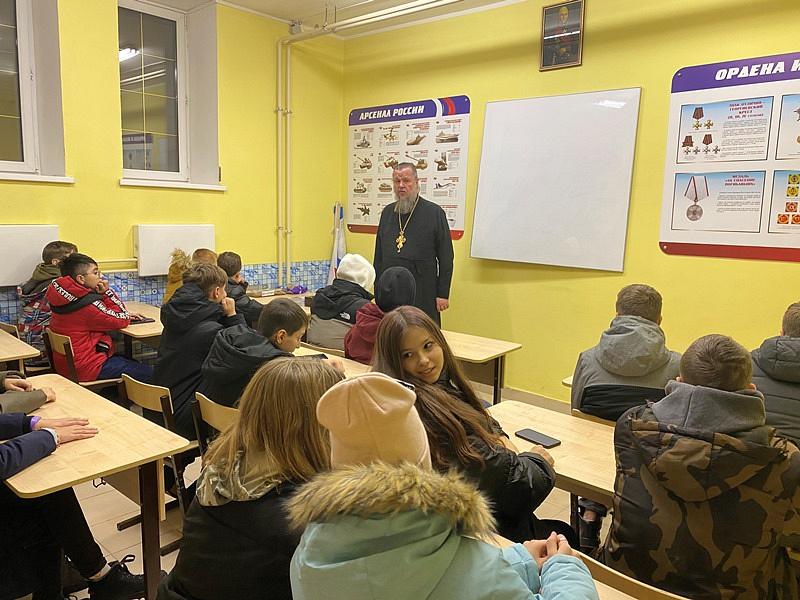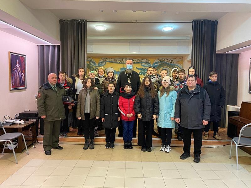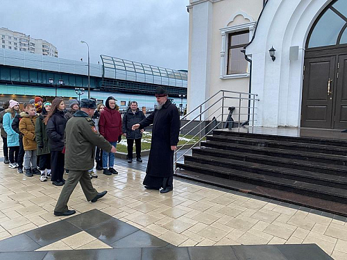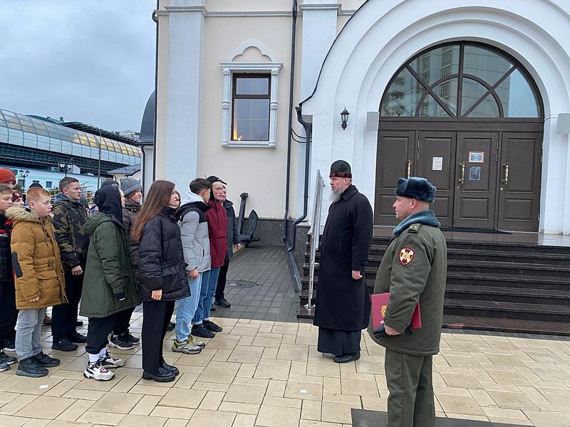 При входе в храм ребят встретил настоятель игумен Дамиан (Залетов), член штаба Юнармии ЮЗАО г. Москвы, который рассказал о строительстве на этом месте храма в честь святого праведного воина Феодора Ушакова.