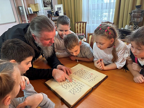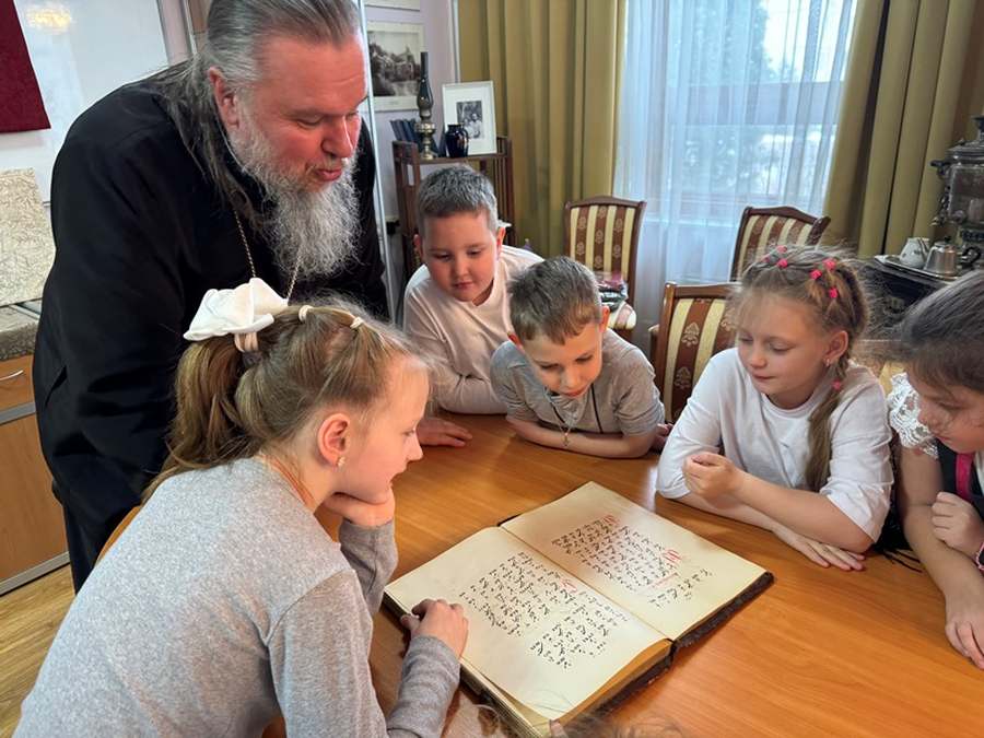 Игумен Дамиан напомнил ребятам о празднике Дне православной книги, рассказал об истории книгопечатания в России. Настоятель показал учащимся школы старинную книгу с древнерусскими нотами, крюками.