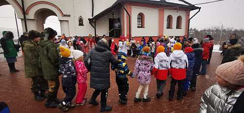 Для детей и их родителей были организованы такие веселые уличные состязания, как шапочные бои, перетягивание каната, жим гири, которые провел руководитель ВПК 6 рота Сажнев Юрий Дмитриевич. С малышами водили хоровод, катали на телеге, запряженной лошадью, и играли в подвижные игры с участием аниматора-скомороха, в роли которого выступила завуч воскресной школы Строганова Юлия Сергеевна.