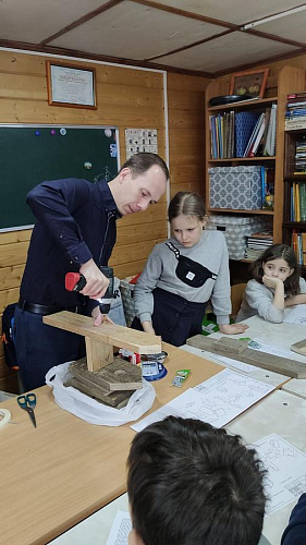 Он многое умеет делать своими руками, и рад научить этому ребят. Александр привез несколько заготовок, чтобы было проще получить готовый домик для птиц, и показывал, как их надо собирать.