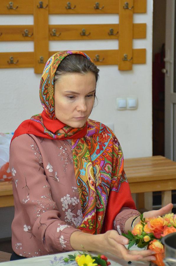 В процессе работы Дарья Михайловна делилась авторскими секретами и нюансами творческого процесса. Отвечала на вопросы присутствующих. Участники узнали названия цветов, зелени, декоративных элементов, из которых можно сделать данный букет. Получили рекомендации, как дольше сохранить его свежим. Создание композиции требует немалого количества времени, усидчивости и фантазии. Такой букет, сделанный своими руками, станет прекрасным комплиментом дорогому учителю.