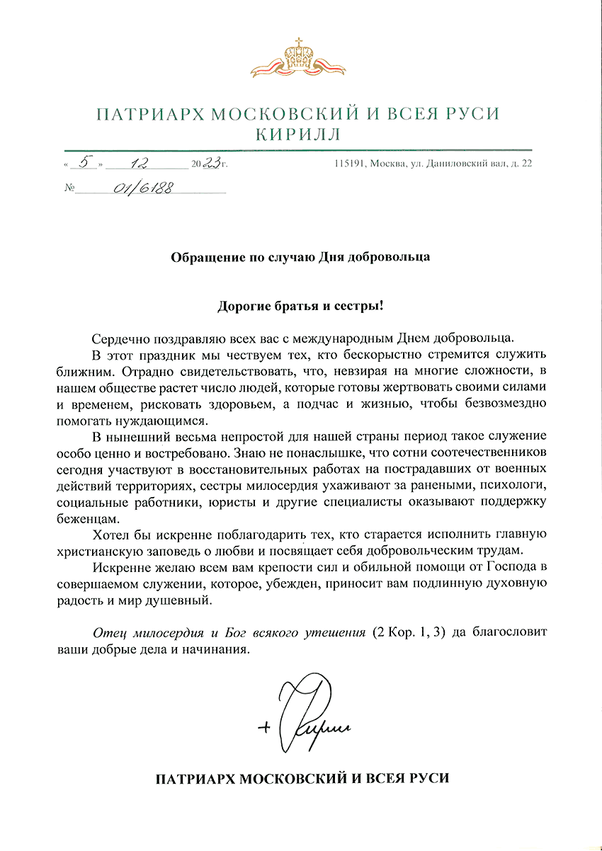 Обращение Патриарха Московского и всея Руси Кириллапо случаю международного Дня Добровольца.