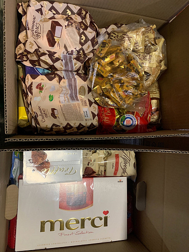 Совместными силами были собраны и упакованы теплые мужские кофты, эластичные бинты, кондитерские изделия, печенья, вафли, сладости, мед, кофе, чай и другие напитки.