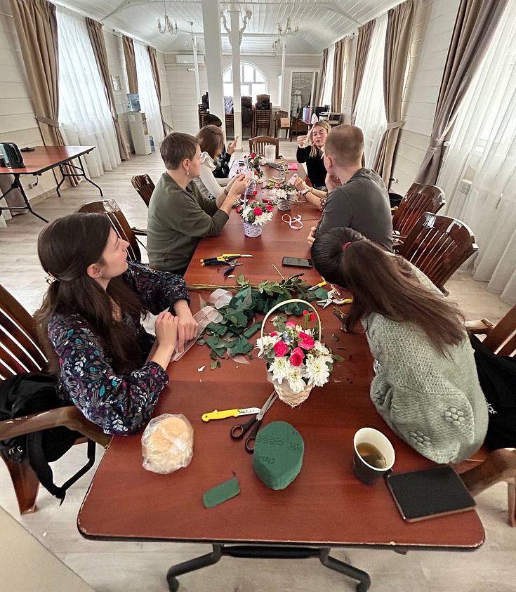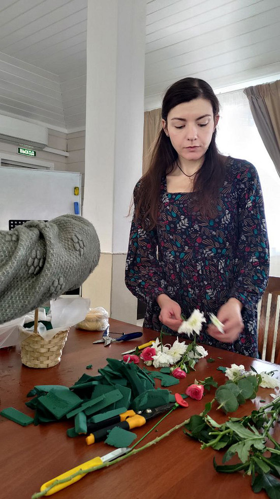 Участники не только наблюдали за процессом, но также пробовали собственные силы в создании композиции из живых цветов на оазисе.