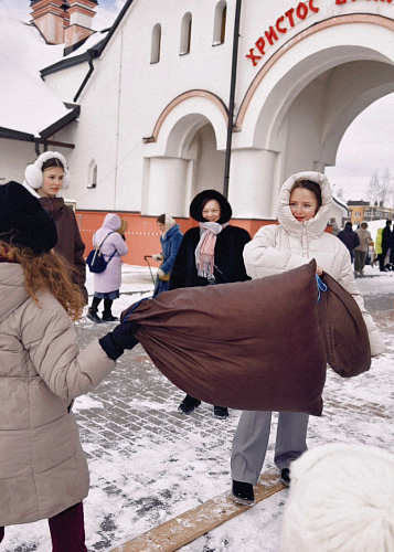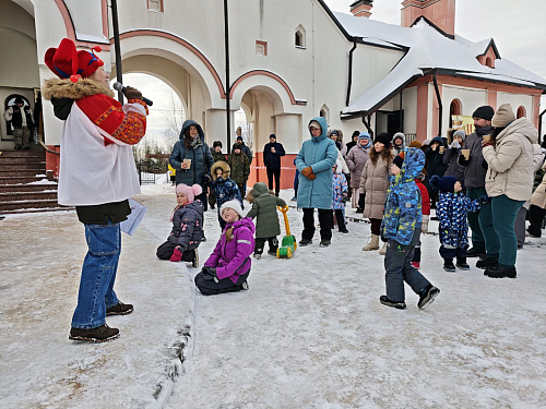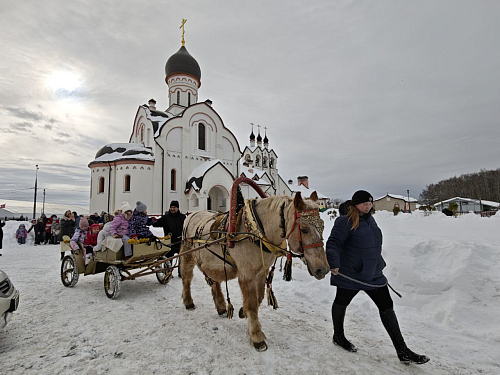 Звучали задорные русские народные песни в исполнении храмовых коллективов, сопровождаемые хороводами, танцами и играми, в которых с удовольствием участвовали и дети, и взрослые. Для малышей было организовано катание на санях, запряженных лошадью.